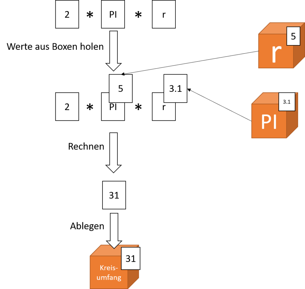 Was passiert jetzt aber beim Kreisumfang. Dort haben wir ja noch keinen Wert, den wir in die Box legen können, sondern der Wert ist von anderen Boxen abhängig. Um den komplexe Ausdruck „2 * PI * r“ auszuwerten holt sich der Computer an jeder Stelle, wo eine Variable steht erst aus der passenden Box den Wert, den diese Variable gerade hat. Wenn nur noch feste Werte, wie 2, 5, 3.1 übrig sind, kann alles zusammengerechnet werden. Das Ergebnis kann jetzt in die Box für den Kreisumfang abgelegt werden.