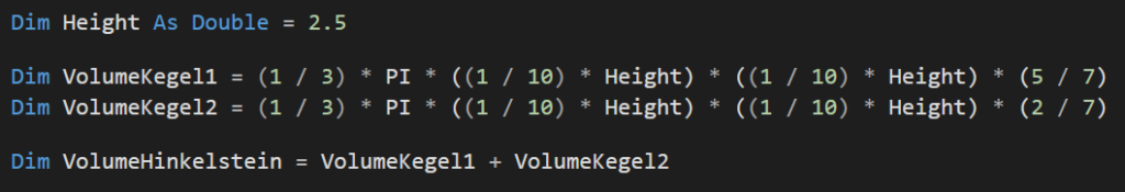 Unsere Funktion bekommt als Eingabe die Höhe eines Hinkelsteins und soll uns als Ausgabe das Volumen zurückgeben. Im Code sieht das wie folgt aus: