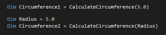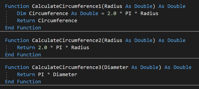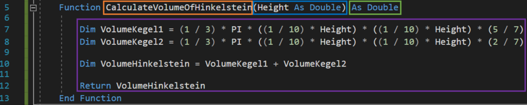 Anschließend folgen die Befehle die die Funktion ausführen soll (in lila) und ein „End Function“. Die Befehle die Ausgeführt werden sollen nennt man auch den Methodenrumpf. Methode ist dabei ein anderes Wort für Funktion. Der Methodenrumpf beschreibt das Verhalten der Funktion und kann ausschließlich auf die Eingabeparameter oder Variablen, die im Rumpf selbst deklariert wurden zugreifen. In diesem Fall kann also nur auf „Height“, „VolumeKegel1“, „VolumeKegel2“ und „VolumeHinkelstein“ zugegriffen werden. Das kann man sich auch wieder mir der Person veranschaulichen, die die Arbeit für die erledigt. Stell dir vor sie wohnt in einer anderen Stadt. Wenn du nun von ihr das Volumen eines Hinkelsteins ausrechnen lassen willst, dann schickst du einen Auftrag. In diesem MUSS die Höhe des Steins stehen, da der Arbeiter sonst nicht arbeiten kann. Dieser kann jedoch bei sich zuhause neue Zwischenergebnisse, wie „VolumeKegel1“, „VolumeKegel2“ und „VolumeHinkelstein“ erstellen. Diese wirst du jedoch nie zu Gesicht bekommen. Du bekommst nur das Ergebnis zurück. Nämlich eine einzige Zahl – das Volumen.