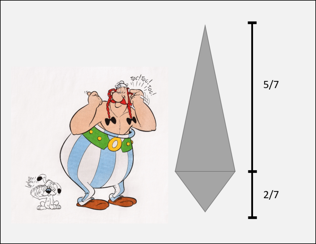 Wenn man beide Augen zu drückt kann man das Volumen eines Hinkelsteines aus dem zweier Kegel zusammensetzen. Obelix sagt dass der obere Teil seiner Steine immer 5/7 der gesamten Höhe ausmachen, während der untere Teil nur 2/7 ausmacht. Die Höhe variiert jedoch von Stein zu stein. Der Radius an der dicksten Stelle Beträgt jedoch immer 1/10 der Höhe.