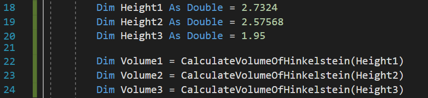 Wenn wir uns beispielsweise Zeile 22 anschauen, sehen wir, wie die Funktion aufgerufen wird. Wir wollen das Ergebnis der Berechnung in die Variable Volume1 schreiben. Der Eingabeparameter der Funktion ist „Height1“. Das heißt der Wert von Height1 wird kopiert und in die Funktion eingesetzt. Dort hat also „Height“ den gleichen Wert. Jedoch würden sich Änderungen von „Height“ nicht auf „Height1“ auswirken.